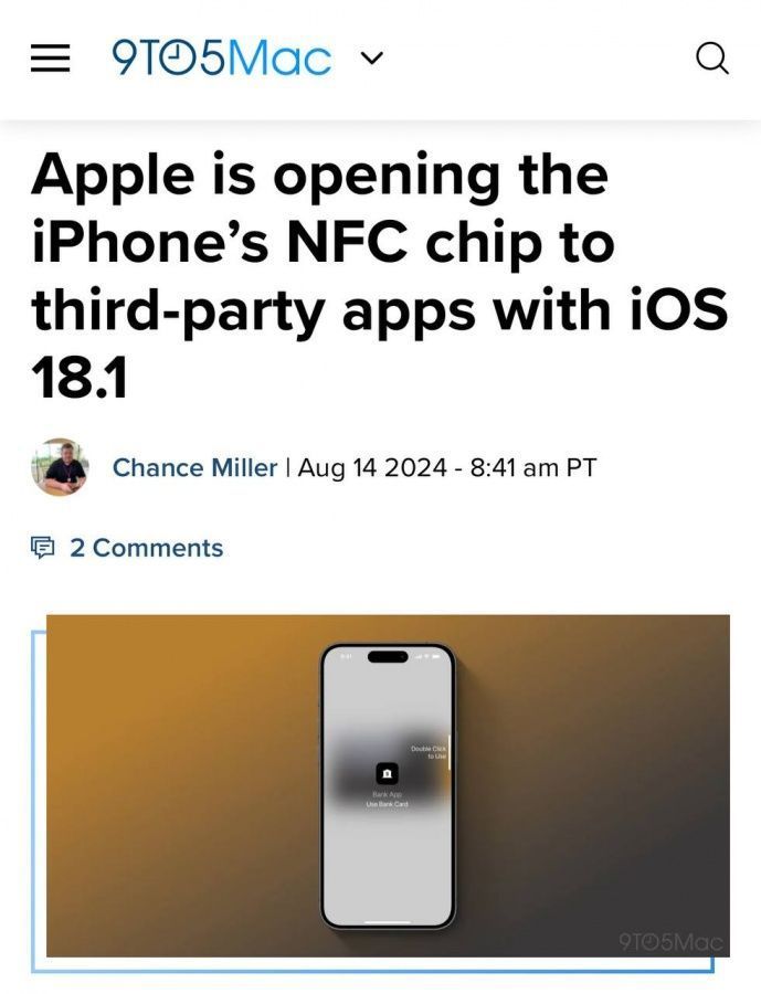 Компания Apple откроет доступ к чипу NFC для всех приложений на iPhone с установленной операционной системой iOS 18.1, релиз которой ожидается в октябре этого года.